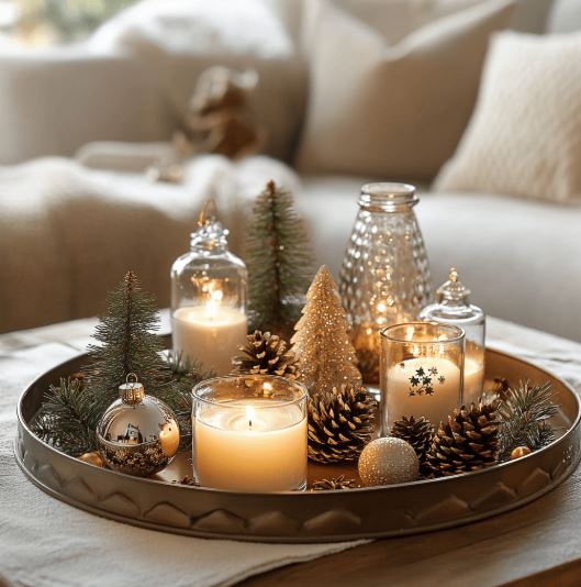 Les miroirs reflètent les lumières du sapin, des guirlandes et des bougies, ce qui démultiplie instantanément la magie. Placez-en un derrière une guirlande LED ou un groupe de bougies pour un effet spectaculaire à coût zéro. Idéal pour les petits espaces ou les pièces plus sombres.